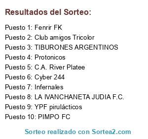 Lista de participantes: Infernales, YPF pirulácticos, C.A. River Platee, LA IVANCHANETA JUDIA F.C., Club amigos Tricolor, Cyber 244, TIBURONES ARGENTINOS, Protonicos, PIMPO FC, Fenrir FK.