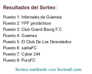 Lista de participantes: YPF pirulácticos, Cyber 244, Guemes, El Club De Los Desvelados, Club Grand Bourg F.C, PuroFC, Infernales de Güemes, satitaFC.