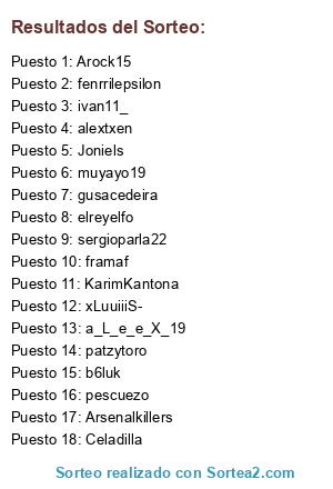 Lista de participantes: a_L_e_e_X_19, ivan11_, framaf, KarimKantona, Celadilla, muyayo19, Arsenalkillers, pescuezo, elreyelfo, Arock15, alextxen, patzytoro, sergioparla22, xLuuiiiS-, gusacedeira, fenrrilepsilon, b6luk, Joniels.