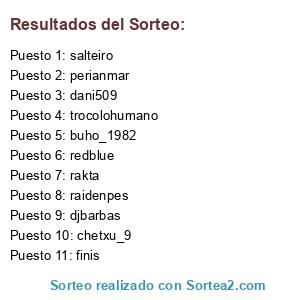 Lista de participantes: chetxu_9, trocolohumano, djbarbas, raidenpes, dani509, salteiro, redblue, finis, buho_1982, perianmar, rakta.