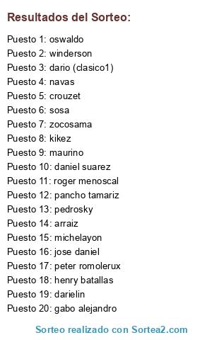 Lista de participantes: jose daniel, henry batallas, peter romolerux, roger menoscal, winderson, michelayon, maurino, pedrosky, zocosama, sosa, kikez, crouzet, darielin, navas, oswaldo, pancho tamariz, gabo alejandro, daniel suarez, dario (clasico1), arraiz.