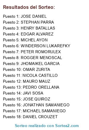 Lista de participantes: CARLO LOPEZ, GIAN ARIAS, HENRY AYON, HONNING, JAIME DE LA CUADRA, JHON ARAUZ, JORGE LUIS DUEÑAS, PEDRO ROMERO, SEBASTIAN MENDOZA, DIEGO VENEZUELA.