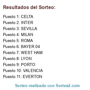 Lista de participantes: BAYER 04, M GLADBACH, SCHALKE, WOLFSBURGO, SEVILLA, VALENCIA, VILLARREAL, BILBAO, CELTA, LYON, WEST HAM, EVERTON, STOKE CITY, TOTTENHAM, MILAN, INTER, LAZIO, ROMA, BENFICA, PORTO.