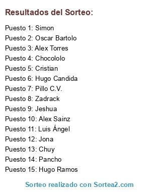 Lista de participantes: Simon, Alex Torres, Jona, Hugo Ramos, Hugo Candida, Alex Sainz, Chuy, Chocololo, Zadrack, Pancho, Jeshua, Cristian, Luis Ángel, Oscar Bartolo, Pillo C.V..