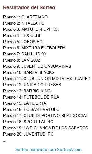 Lista de participantes: R. BOYS, LIKE FC, LA HUERTA, LX7, CLUB DEPORTIVO REAL SOCIAL, PEÑA99, SPORT LATINO, SANTA ROSA FC, CAP, MIXTURA FUTBOLERA, SIEMPRE AMIGOS, MANUELPEREZ, MATUTE NIUPI F.C., WALON F.C., UNIDAD CIPRESES, TITO DRAGO 81, BAYERN PUCP, ESPARTANOS, JUVENTUD CASUARINAS, CLUB FEDERICO SOTOMAYOR, CLUB JUNIOR MORALES DUAREZ, EL CARTEL FC, FUTEBOL DE RUA, JUVENTUD FC, GRAN COMBO, ACCION Y VALOR, LAM 2002, ATLETICO LEURI, BARZA BLACKS, FC SAN BARTOLO, SPORTING CLUB, LA MÁQUINA F.C., BIOSUPPORT INTERNATIONAL, BALCONCILLO FC, LOS DE CAASA, LOBOS FC, LEX CUBE, BARRIO KING, N TALLA FC, DEFENSOR SPORTING, SAN LUIS 99, SPORT IQUITOS, CLUB DEPORTIVO DEFENSOR ANGARAES, LA PICHANGA DE LOS SABADOS, FC SATANES, CLARETIANO, PUCUSANA FC.