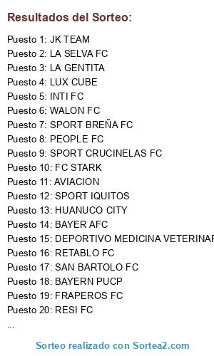 Lista de participantes: MIXTURA FUTBOLERA, LA LOGIA FC, RETABLO FC, SPORT BREÑA FC, FC PANDO, ACCIÓN Y VALOR, LA CLASE VICTORIANA, JK TEAM, FC STARK, N TALLA FC, SPORT CRUCINELAS FC, BAYERN PUCP, ATLETICO LEURI, ESPAÑA, ALIANZA BREÑA, SPORT IQUITOS, FC BALCONCILLO, UNIDAD CIPRESES FC, PATIÑO FC, SAN BARTOLO FC, WALON FC, PEOPLE FC, AVIACION, RESI FC, LA SELVA FC, DEPORTIVO CUMMINS PERU, FRAPEROS FC, ESCUELA DEPORTIVA EL REY, FENIX FBC, HUANUCO CITY, SPORT BARRANCA, BAYER AFC, LOS PIRATAS FC, LA HUERTA, DEPORTIVO MEDICINA VETERINARIA, CLUB JUNIOR M. DUAREZ, INTI FC, BARZA BLACKS, BARRANCO TENIS CLUB, LUX CUBE, SENATI, AYAYAY FC, SPORT ANDAHUAYLAS, LA GENTITA.