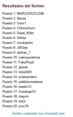 Lista de participantes: Chhimichurri, MARCOSCOLD96, Becas, pmc76, pablitoomaidana, maxijoga10, darkas_7, monkybdm, FakuFloyd, J053ee, nekropunkmza, Dead_Killer, jipisas, Slither, peeter12, Goor1, lobo0001, piratasodero, lok3r, dieycin.