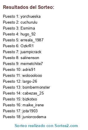 Lista de participantes: memetchite7, cuchurulu, juampicrack, Esmirna, hugo_92, maike_irene, adris91, OzkrR1, salinenson, yorchueska, juniorcodema, bombermonster, cabezas_25, erreala_1987, largo-26, bizkotxo, wolooolooo, jota1903.