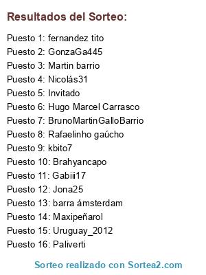 Lista de participantes: Maxipeñarol, Uruguay_2012, Gabiii17, Martin barrio, Nicolás31, Paliverti, Jona25, fernandez tito, kbito7, Brahyancapo, barra ámsterdam, Hugo Marcel Carrasco, Rafaelinho gaúcho, BrunoMartinGalloBarrio, GonzaGa445, Invitado.