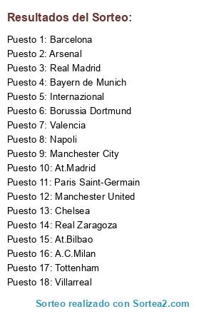 Lista de participantes: A.C.Milan, Arsenal, At.Bilbao, At.Madrid, Barcelona, Bayern de Munich, Borussia Dortmund, Chelsea, Internazional, Manchester City, Manchester United, Napoli, Paris Saint-Germain, Real Madrid, Real Zaragoza, Tottenham, Valencia, Villarreal.
