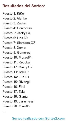 Lista de participantes: Tala, Lins 69, Garu85, Jacky GC, KiKo, Siareiros GZ, Xemo, Alariko, JFK 01, Gameros, Ganja, Casty GZ, Firol, Bios, Zacks, Rivazgil, IVICP3, Torta83, Redoka, Corcontas, Morao84, Laudrupin9, Jairumessi.