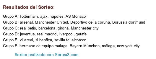 Lista de participantes: Deportivo de la coruña, barcelona, AS Monaco, Bayern München, villareal, Manchester city, Manchester United, sl benfica, girona, getafe, málaga, alcorcon, new york city, real madrid, sevilla fc, napoles, Tottenham, arsenal, Borussia dortmund, juventus, real betis, ajax, liverpool, hermano de equipo malaga.