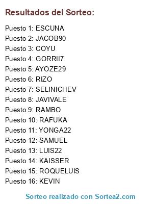 Lista de participantes: SELINICHEV, YONGA22, RAFUKA, GORRII7, KEVIN, AYOZE29, ESCUNA, SAMUEL, JACOB90, COYU, ROQUELUIS, KAISSER, RIZO, RAMBO, JAVIVALE, LUIS22.