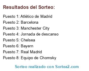 Lista de participantes: Atlético de Madrid, Manchester City, Chelsea, Equipo de Chomsky, Barcelona, Bayern, Real Madrid, Jornada de descanso.