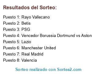 Lista de participantes: Manchester United, Betis, PSG, Rayo Vallecano, Lazio, Valencia, Real Madrid, Vencedor Borussia Dortmund vs Aston Villa.