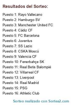Lista de participantes: Cádiz CF, Juventus, Liverpool, Hamburgo SV, Real Betis Balompié, CSKA Moscú, Villarreal CF, Rayo Vallecano, Athletic Club, FC Barcelona, PSG, Fenerbahçe SK, SS Lazio, Real Madrid, Valencia CF, Manchester United FC.
