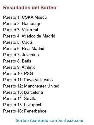 Lista de participantes: Manchester United, Sevilla, Real Madrid, Atlético de Madrid, Fenerbahçe, Rayo Vallecano, Athletic, Hamburgo, Cádiz, Barcelona, Juventus, Liverpool, Betis, CSKA Moscú, PSG, Villarreal.