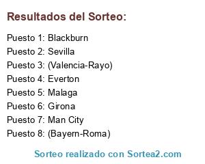 Lista de participantes: (Valencia - Everton), (Malaga - PSG ), (Bilbao - Arsenal ), (Blackburn - Real Sociedad ), (Bayern - Espanyol ), (Man United - Barcelona), (Borussia - Sevilla ), (Roma - Girona ).