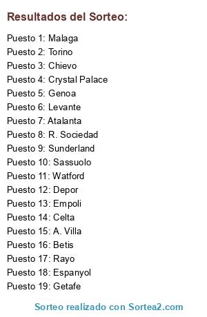 Lista de participantes: Atalanta, Chievo, Empoli, Genoa, Sassuolo, Torino, Betis, Rayo, Espanyol, Depor, R. Sociedad, Celta, Getafe, Levante, Malaga, A. Villa, Watford, Sunderland, Crystal Palace.