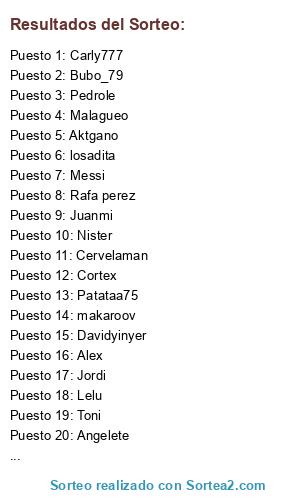 Lista de participantes: DJ_Luian, Adumat_6, Lelu, Cortex, Diego, Toni, losadita, Carly777, Alex, Messi, Angelete, makaroov, Bubo_79, Aktgano, Pedrole, Juanmi, Josevallecas, Rafa perez, Davidyinyer, Nister, Patataa75, Malagueo, Jordi, Cervelaman.