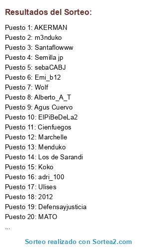 Lista de participantes: Maschikito, Molito, July, LeitoCabj12, Santaflowww, Eber, 2012, KORN, Mellu, Koko, Wolf, Tony_+10, EL_GASOLERO, Los de Sarandi, m3nduko, M3nd0C!n[O], play_boy10arg, Agus Cuervo, PochoFortin, Maty., Corto, MATO, Menduko, fer-21, Alberto_A_T, Marshal90, liooRC, Semilla jp, Marchelle, AKERMAN, Jero, Pesebrero, CabezaDeÑoquis, Defensayjusticia, Seth, Exe, bob_almagro, sebaCABJ, Cienfuegos, tiki tiki, "ëxxe, Pochi, RosarioCentral', Ulises, adri_100, _BocaJuniors, Wally, ELLOCOMARZO, ZurdaCabj10, Guidolepra, Boster Milan, NahuelCAI, EXE_TATENGUE89, Picaron, ElPiBeDeLa2, Eliamm, Luciano, Emi_b12, shk_, danel:.