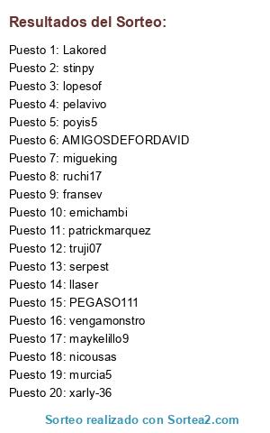 Lista de participantes: emichambi, PEGASO111, serpest, nicousas, truji07, maykelillo9, llaser, poyis5, patrickmarquez, ruchi17, AMIGOSDEFORDAVID, vengamonstro, xarly-36, stinpy, fransev, pelavivo, lopesof, Lakored, migueking, murcia5.