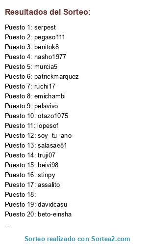 Lista de participantes: emichambi, stinpy, lopesof, assalito, pelavivo, pegaso111, truji07, llaser , nicousas, murcia5, serpest, patrickmarquez, nasho1977, otazo1075, ruchi17, poyis5, lakored, danijugon11, javigalvan, davidcasu, adrrian36, beto-einsha, benitok8, soy_tu_ano, beivi98, salasae81, erik042, maritxurri, .