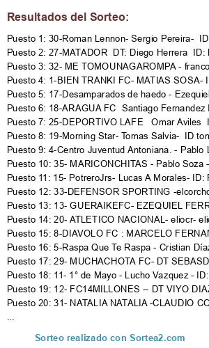 Lista de participantes: 1-BIEN TRANKI FC- MATIAS SOSA- ID: BIENTRANQUIFC, 2-MANDALE BALIN- EMILIANO SEBASTIAN- ID EMOBOCA, 3-LOSGALACTICOS21-FEDE BELTRANDO-ID: LOSGALACTICOS21, 4-Centro Juventud Antoniana. - Pablo Luciano -ID:pablo_CJA, 5-Raspa Que Te Raspa - Cristian Díaz - ID: AguiluchoComRiv, 6-Argentino (R) - Mariano Castellano - ID: Argentino de Rosario, 7-JAH LOVE FC - PABLO VAZQUEZ - ID: JAH_LOVE_FC, 8-DIAVOLO FC : MARCELO FERNANDEZ- ID: marcelo_98-01, 9-riverpool fc : lucas venialgo . ID: lautaro09, 10-DEPUTAS F.C: LEONARDO FRANCISCO BONATTI ID: LEOARGENTOMDQ, 11- 1° de Mayo - Lucho Vazquez - ID: Primero_de_Mayo, 12- FC14MILLONES -- DT VIYO DIAZ --- ID:FC14MILLONES, 13- GUERAIKEFC- EZEQUIEL FERRO- ID: GUERAIKEFC, 14- Aston Birra - Gonza rab - ID: Gonzarab, 15- PotreroJrs- Lucas A Morales- ID: PotreroJrs, 16-Ñubelito- Joel Blanco (loco-bielsa en foro)- ID: NIUBELITO, 17-Desamparados de haedo - Ezequiel Dominguez - id desamparadosfc, 18-ARAGUA FC Santiago Fernandez ID santo__77, 19-Morning Star- Tomas Salvia- ID tomasmorning, 20- ATLETICO NACIONAL- eliocr- eliocabj, 21- ca leproso- hernan morelli- hernan1973-, 22- Real Albañil-Dt Robert Nesta (VascoHaedo)- ID en tramite, 23-PINK FLOYD : IVAN NEWELLS - ivanovik_10, 24- FUTURO FC: Ansony Palomino Fuentes ID: palo30mino-, 25-DEPORTIVO LAFE Omar Aviles ID: deportivolafe, 26- LOS FORZOSOS DE ALMAGRO FACE: GABRIEL MANZO ID: LOS_FORZOSOS_D_A, 27-MATADOR DT: Diego Herrera ID: DIEGOTIGRE-PCA, 28- KRATOS FC : TREZEGUET32 ID VAMOSROJO2012, 29- MUCHACHOTA FC- DT SEBASDZIE ID SEBASDZIE, 30-Roman Lennon- Sergio Pereira- ID CA-ROMAN-LENNON, 31- NATALIA NATALIA -CLAUDIO COCA- AYRJAZ, 32- ME TOMOUNAGAROMPA - franco mojica- franco_canob74, 33-DEFENSOR SPORTING -elcorcho, 34- Vende humo Daniel Altamirano id vende--humo, 35- MARICONCHITAS - Pablo Soza - MAR-ICONCHITAS, 36-C.A.TURU TURU1011, 37-PATRICIO REY - Eduardo Messagli - ID: Messagli.