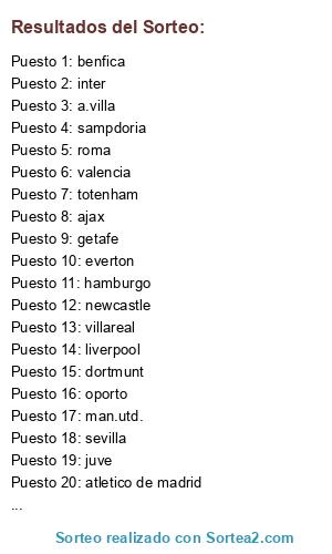Lista de participantes: a.villa, ajax, arsenal, athletic, atletico de madrid, dortmunt, barça, bayern, benfica, chealsea, depor, everton, getafe, hamburgo, inter, juve, liverpool, madrid, man.city, man.utd., milan, newcastle, o.lyion, oporto, roma, sampdoria, sevilla, totenham, valencia, villareal.