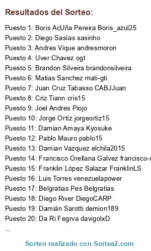 Lista de participantes: Jano Santiago JanitoY2J., Sergi Vidal Cardona Elprimodepego, Diego River DiegoCARP, Marcelo Moreira Mancebo chelobest, Uver Chavez ogt, Manuel David nick: ixcam, Fabian Mauricio Gonzalez-Latapiatt Aguilar Kist, Chente Rod WE_Master, Andres Vique andresmoron, Adr Rodsan jove_adri, Arku Pes arku, Belgratias Pes Belgratias, Rodri Zamora Rodrii271, Jorge Meler JORGE-RIVER, Marcelo Casco Carbonero Marcecarbonero1, Sublimados Rosario Mou27, Alejandro Farina Ramos estratega, Javier Guastini Guasti, Boris AcUña Pereira Boris_azul25, Pablo Mauro pablo15, Adrián Viscovi cantor29, Diabolis Interium fitofarais, Mauro Sanchez kurilin, Sebastian Luque Seba2015, Brandon Silveira brandonsilveira, Damian Amaya Kyosuke, Joel Andres Piojo, Scz Ajd Alejandros80, ya tengo el original, Mauricio Acevedo Lagos chubaka, Federico Compaired fedinho, Franklin López Salazar FranklinLS, Ramiro Saavedra Zubiaga ramisaave, Diego Sasías sasinho, Pablo Bittermann polzlp, Damián Sarotti demion189, Matias Sanchez mati-gti, Damian Vazquez elchila2015, Francisco Orellana Galvez francisco-cabj, Russo Carlos Ariel russitooo, Jorge Ortíz jorgeortiz15, James Goz jamesgoz, Da Ri Fegrva davigolxD, Bruno Ceccotti Ceccottibruno, Marcelo Seifert Matadero2015, Criz Tiann cris15, Luis Torres venezuelapower, Harun Fulano Jaimes Harun, Germán Gao chutix2, Juan Cruz Tabasso CABJJuan, Vigor Santos Canuto. VITORSFC.