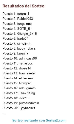 Lista de participantes: adn_gareth, adri_casti90, albertmdr, Alvaromm2307, bibby_lakers, danimese, davimotxo, drose14, eldardero, faren_7, fraanesete, frade04, Giorgio_2k15, hetfieldcc, Jvico8, kontzermu, mantequilla04, Nhygren, Olly34, Pablo1093, punterodomin, renko80, Seriko, sirnolimit, SOTE_5, Srpeni, The23King, tungsteno, tururu11, Tytybasket.