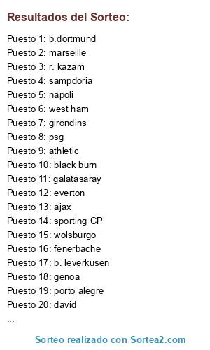 Lista de participantes: Fiorentina, genoa, lazio, napoli, palermo, sporting CP, sampdoria, fenerbache, galatasaray, zenit, r. kazam, CSKA movska, olimpyacos, west ham, birminghan, black burn, everton, fulham, ajax, girondins, lille, marseille, psg, villareal, athletic, porto alegre, werder bremen, b. leverkusen, b.dortmund, hamburgo, schalke 04, stutgart, wolsburgo, besiktas, kike, david, andres, arturo.