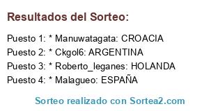 Lista de participantes: * Gorrii7: FRANCIA, * Black-VR46: URUGUAY, * Kratospiti: BELGICA, * Carly777: COSTA DE MARFIL, * Lider2012: GHANA, * Poder_negrito: COLOMBIA, * Edumena: BRASIL, * Malagueo: ESPAÑA, * Victor_moono: INGLATERRA, * Jimenystelrooy85: ALEMANIA, * Roberto_leganes: HOLANDA, * Ckgol6: ARGENTINA, * Bubo___79: ITALIA, * Fabiete_murcia: PORTUGAL, * Manuwatagata: CROACIA, * Solari6: CHILE.