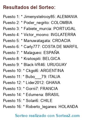 Lista de participantes: * Gorrii7: FRANCIA, * Black-VR46: URUGUAY, * Kratospiti: BELGICA, * Carly777: COSTA DE MARFIL, * Lider2012: GHANA, * Poder_negrito: COLOMBIA, * Edumena: BRASIL, * Malagueo: ESPAÑA, * Victor_moono: INGLATERRA, * Jimenystelrooy85: ALEMANIA, * Roberto_leganes: HOLANDA, * Ckgol6: ARGENTINA, * Bubo___79: ITALIA, * Fabiete_murcia: PORTUGAL, * Manuwatagata: CROACIA, * Solari6: CHILE.