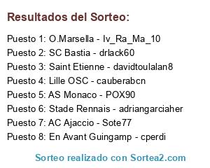 Lista de participantes: Lille OSC - cauberabcn, Saint Etienne - davidtoulalan8, SC Bastia - drlack60, AS Monaco - POX90, En Avant Guingamp - cperdi, AC Ajaccio - Sote77, O.Marsella - Iv_Ra_Ma_10, Stade Rennais - adriangarciaher.
