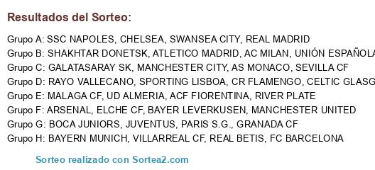 Lista de participantes: RAYO VALLECANO, ARSENAL, CHELSEA, BOCA JUNIORS, RIVER PLATE, JUVENTUS, ELCHE CF, FC BARCELONA, UNIÓN ESPAÑOLA DE CHILE, AS MONACO, VILLARREAL CF, UD ALMERIA, MALAGA CF, ACF FIORENTINA, SEVILLA CF, SPORTING LISBOA, REAL MADRID, BAYERN MUNICH, ATLETICO MADRID, MANCHESTER UNITED, CELTIC GLASGOW, SHAKHTAR DONETSK, REAL BETIS, BAYER LEVERKUSEN, SWANSEA CITY, MANCHESTER CITY, SSC NAPOLES, GALATASARAY SK, PARIS S.G., CR FLAMENGO, AC MILAN, GRANADA CF.