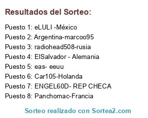 Lista de participantes: eLULI -México, ChurrozMex96- España, Prominente-Portugal, Panchomac-Francia, FerLife - Inglaterra, ElSalvador - Alemania, brasil hefrot, Argentina-marcoo95, ENGEL60D- REP CHECA, TBAN30-ESCOCIA, eas- eeuu, Car105-Holanda, radiohead508-rusia.