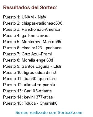 Lista de participantes: Santos Laguna - Eluli, Cruz Azul-Promi, Panchomac-America, UNAM - Nafy, Monterrey- Marcoo95, chiapas-radiohead508, gatitom chivas, tigres-eduardinh0, elmejor123 - pachuca, allanallen-puebla, Morelia engel60d, Toluca - Churrinh0, Car105-Atlante, kevin1377-atlas, tban30 -queretaro.