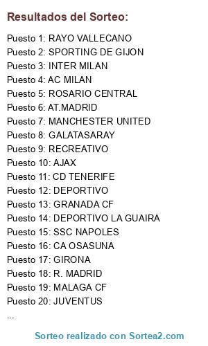 Lista de participantes: RAYO VALLECANO, ARSENAL, CHELSEA, BOCA JUNIORS, RIVER PLATE, JUVENTUS, ELCHE CF, FC BARCELONA, UNIÓN ESPAÑOLA DE CHILE, AS MONACO, VILLARREAL CF, UD ALMERIA, MALAGA CF, ACF FIORENTINA, SEVILLA CF, SPORTING LISBOA, REAL MADRID, BAYERN MUNICH, ATLETICO MADRID, MANCHESTER UNITED, CELTIC GLASGOW, SHAKHTAR DONETSK, REAL BETIS, BAYER LEVERKUSEN, SWANSEA CITY, MANCHESTER CITY, SSC NAPOLES, GALATASARAY SK, PARIS S.G., CR FLAMENGO, AC MILAN, GRANADA CF.