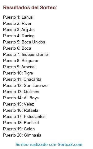 Lista de participantes: All Boys, Arg Jrs, Arsenal, Belgrano, Boca, Colon, Estudiantes, Gimnasia, Independiente, Lanus, Quilmes, Racing, Rafaela, River, San Lorenzo, Tigre, Velez, Banfield, Boca Unidos, Chacarita.
