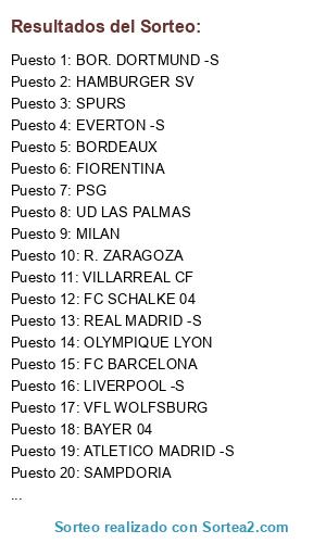 Lista de participantes: MILAN, AJAX -S, ARSENAL -S, ATLETICO MADRID -S, BORDEAUX, AT. OSASUNA -S, CHELSEA -S, FC BARCELONA, FC SCHALKE 04, GETAFE CF, LIVERPOOL -S, MANCHESTER CITY, RAYO VALLECANO, REAL MADRID -S, REAL SOCIEDAD -S, SPORTING CP -S, VFB STUTTGART -S, VFL WOLFSBURG, VILLARREAL CF, ATHLETIC BILBAO, BOR. DORTMUND -S, EVERTON -S, FC BAYERN, FIORENTINA, HAMBURGER SV, INTER, LAZIO -S, MALAGA CF, OLYMPIAKOS, PANATHINAIKOS, RCD ESPANYOL, ROMA, SPURS, UD LAS PALMAS, UDINESE -S, WERDER BREMEN, BAYER 04, BOCA JUNIOR -S, NAPOLI, NEWSCASTLE UTD, OLYMPIQUE LYON, PSG, RC DEPORTIVO -S, R. SPORTING, R. ZARAGOZA, SAMPDORIA, SEVILLA.