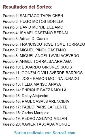 Lista de participantes: Deiby Alejandro, Lenin Marx Vasquez Chavez, Alexis Vásquez, Roberto Michell Bravo Falen, Abel Palafox Gomez, Josue Landa, Benja Ayala, Carlos Marquez, Paco Olmos, Ever Olmos Mo, Adrian D. Castro, MARIO MADARIAGA CUETO, IVAN REQUENA CASADO, JOSE FRANCISCO CORREA MONTESDEOCA, MIGUEL PIÑOL CASTAÑO, ISMAEL SAUCEDO PRADOS, JOAN ESPINA BRENES, HUGO MOTOS BONILLA, JOAN MACHUCA ESPADA, PABLO CARPINTERO SEIJO, FELIX SANCHEZ CARRETERO, ALFONSO GUILLEN MATAS, JOSE CARLOS SOLE TRUJILLO, SAMUEL BARRACHINA URRUTIA, ALBERTO BLESA PALLAS, GABRIEL BOLUDA VIERA, LORENZO POSADA PEÑAS, RAMON VALLS PUENTE, JOAQUIN VENDRELL COLAS, XAVIER IÑIGO CLIMENT, ESTEBAN SERRANO LLUCH, MANUEL ARMENGOL POLANCO, DANIEL ALMODOVAR CAMPOS, VICTOR MANUEL CASTELLANOS AUGUSTO, JAVIER VICENTE OVIEDO, SANTIAGO TAPIA CHEN, CESAR DIALLO MARQUEZ, JOSE IGNACIO MESTRES BRIZ, MIGUEL OLLE GRAÑA, JOSE VARONA OLIVE, MARCOS MIRANDA BONILLO, RAFAEL AYUSO DIEZ, JOSE MANUEL FUENTE BENAVENTE, JOSE IGNACIO MARTORELL ARRIAGA, VICENTE DE LAS HERAS BALAGUER, JOSE RAMON MOLINA JURADO, ANTONIO OLLER AGUSTI, PEDRO AGUAYO MILLAN, CESAR BORREGUERO ARIAS, JOSE RAMON DEL CAMPO GALIANO, GONZALO TALAVERA FRANCO, PABLO PARIS LAFUENTE, DAVID MONJE DEL AMO, DIEGO BERNA LOBO, JUAN CASTELL SOLANA, FRANCISCO PEÑALVER JULIAN, JOSE IGNACIO VINUESA PALACIN, ROBERTO FRAILE CARRASCAL, MIGUEL ANGEL LAVIN ACEVEDO, GONZALO VILLAVERDE BARRIOS, JOSEP SALGUEIRO GABALDON, CARLOS OSORIO ALEGRIA, HUGO MUÑIZ VILLALOBOS, ANGEL SABORIDO AGUDO, EMILIO HEVIA GOMARIZ, EDUARDO GIRONES SOLIS, RAUL CASALS ARENCIBIA, CARLOS GUERRA ARRIETA, XAVIER TABOADA MONGE, RAUL SECO ALBEROLA, JUAN ANTONIO CAÑETE FILGUEIRA, FELIX MANSO ANAYA, RICARDO NOVAS TUR, SANTIAGO DE LA IGLESIA PACHON, MARIO CORBACHO ROVIRA, JORGE VICARIO AMAYA, ENRIQUE BAEZA MOLLA, JOSE VILLAREJO PADILLA, SANTIAGO BELTRAN PATIÑO, GONZALO VILLALON TRINIDAD, ALVARO VALCARCEL ALEGRIA, AGUSTIN ROA CASADO, ANGEL TORRALBA ARRIAGA, JUAN MANUEL SALVADOR VILLAESCUSA, ISMAEL CASTAÑO BERNAL, LORENZO OJEDA FARIÑA, JAIME DAZA CORPAS, PEDRO BENEDICTO BURGOS, MARIANO LLORCA MEJIAS, FRANCISCO JOSE TOME TORRADO, FELIX BALLESTA ARMERO, PEDRO GARZON SUREDA, JOSE LUIS ANTEQUERA MORALEDA, JORGE BALAGUER GALIANO, CARLOS DIAZ ABRIL, JUAN ANTONIO DAVILA CARRANZA, ANDRES ORELLANA REINOSO.