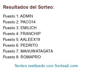 Lista de participantes: AALEEX19, PACO14, ROMAPRO, PEDRITO, FRANCHIP, EMILICH, ADMIN, MANUWATAGATA.