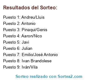 Lista de participantes: Andreu/Lluis, Aaron/Nico, Iván/Vila, Emilio/José Antonio, Antonio, Pinaqui/Genis, Julian, Ivan Brandolese, Javi.