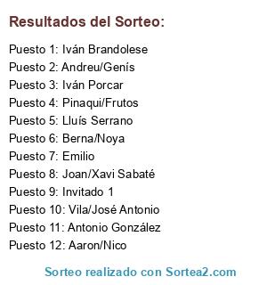 Lista de participantes: Antonio Gonzalez, Ivan/vila, Genis/Andreu, Pinaqui/Julian, Luis Fernande/Dani algaba, Javi romero, Ivan brandolese, Xavi/Joan, LLuis serrano, Enric carrera.
