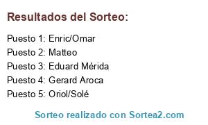 Lista de participantes: Eduard Mérida, Gerard Aroca, Oriol/Solé, Enric/Omar, Matteo.