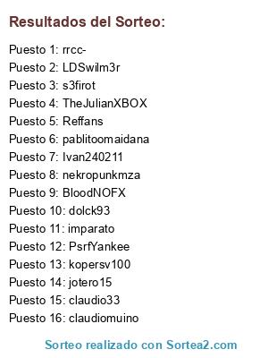 Lista de participantes: kopersv100, imparato, nekropunkmza, PsrfYankee, TheJulianXBOX, pablitoomaidana, dolck93, LDSwilm3r, claudio33, rrcc-, s3firot, Reffans, Ivan240211, jotero15, BloodNOFX, claudiomuino.