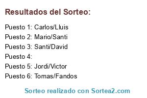 Lista de participantes: Carlos/Lluis, Tomas/Fandos, Santi/David, Jordi/Victor, Mario/Santi, .