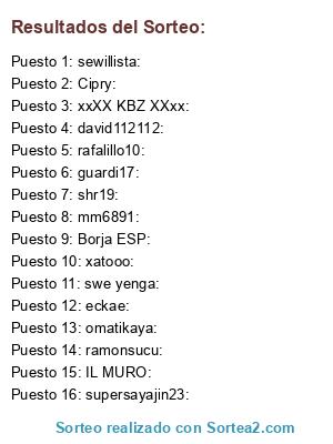 Lista de participantes: Borja ESP: , omatikaya: , shr19: , guardi17: , xatooo: , mm6891: , Cipry: , xxXX KBZ XXxx: , eckae: , IL MURO: , supersayajin23: , ramonsucu: , swe yenga: , david112112: , rafalillo10: , sewillista:.