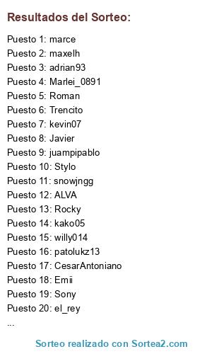 Lista de participantes: adrian93, ALVA, CesarAntoniano, dario, el soldier, el_rey, el_vicio, Emii, Javier, jlatripero, juampipablo, kako05, kevin07, marce, Marlei_0891, maxelh, patolukz13, Rocky, roma25, Roman, snowjngg, Sony, Stylo, Trencito, willy014.